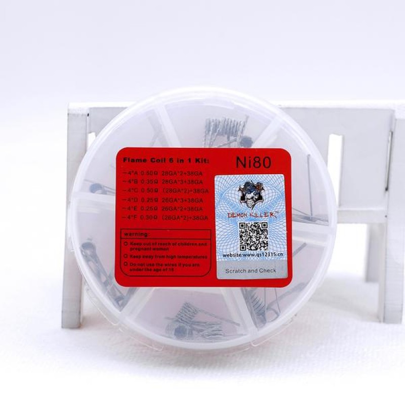 Details: Demon Killer Flame Coil 6 in1 Ni80 Kit is specailly designed for DIY RDA/RTA/RBA atomizers. Made from Ni80 Nichrome 80 wires, including Flame Coil A, 0.4 ohm, 28GA x 2 + 38GA; Flame Coil B, 0.3 ohm, 28GA x 3 + 38GA; Flame Coil C, 0.4 ohm, (28GA x 2) + 38GA; Flame Coil D, 0.12 ohm, 26GA x 3 + 38GA; Flame Coil E, 0.2 ohm, 26GA x 2 + 38GA; Flame Coil F, 0.3 ohm, (26GA x 2) + 38GA. Technical..