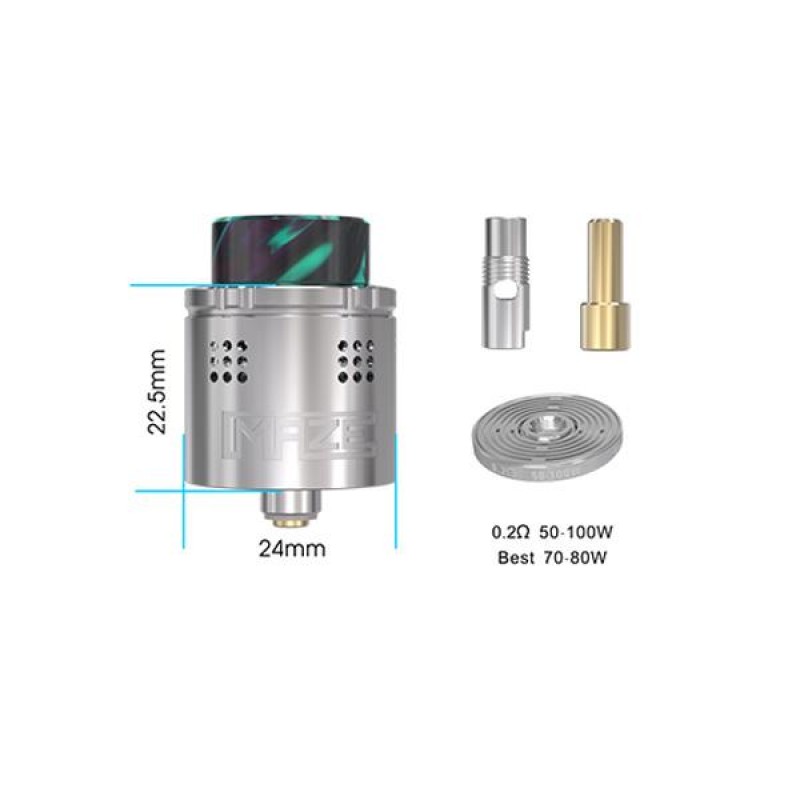 Details: Say hello to the first Sub Ohm BF RDA in the market - Vandy Vape Maze Sub Ohm BF RDA Atomizer. This 24mm diameter, 2ml vape juice capacity atomizer is compatible with both regulated and unregulated/ mechanical mods, depending on your preferences. The construction is a gleaming stainless steel, and it’s chassis is highly durable. Featuring the innovative, dense-heating Maze coils, the per..